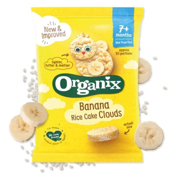 Απολαυστικά ελαφριές, οι Ρυζογκοφρέτες Clouds Μήλο φτιάχνονται από βιολογικό ρύζι, χυμό Μήλου και Κανέλα. Χάρη στο μελετημένο σχήμα τους πιάνονται ευκολότερα από τα μικρά δαχτυλάκια του μωρού σας, ενθαρρύνοντας το να τρέφεται μόνο του ενώ, η μαλακή υφή τους προστατεύει τα ούλα του. Είναι το ιδανικό πρώτο finger food για να εξερευνήσει νέες γεύσεις και υφές! Κατάλληλο από 7 μηνών.